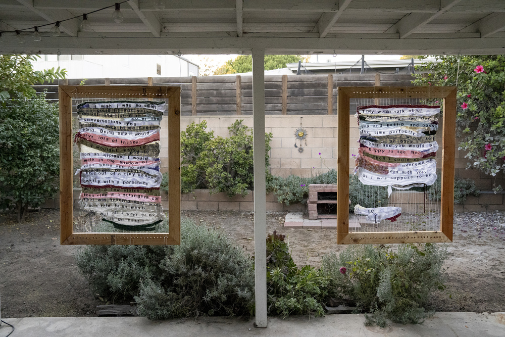 woven fabric with stamped text, yarn, safety pins, wood frame
